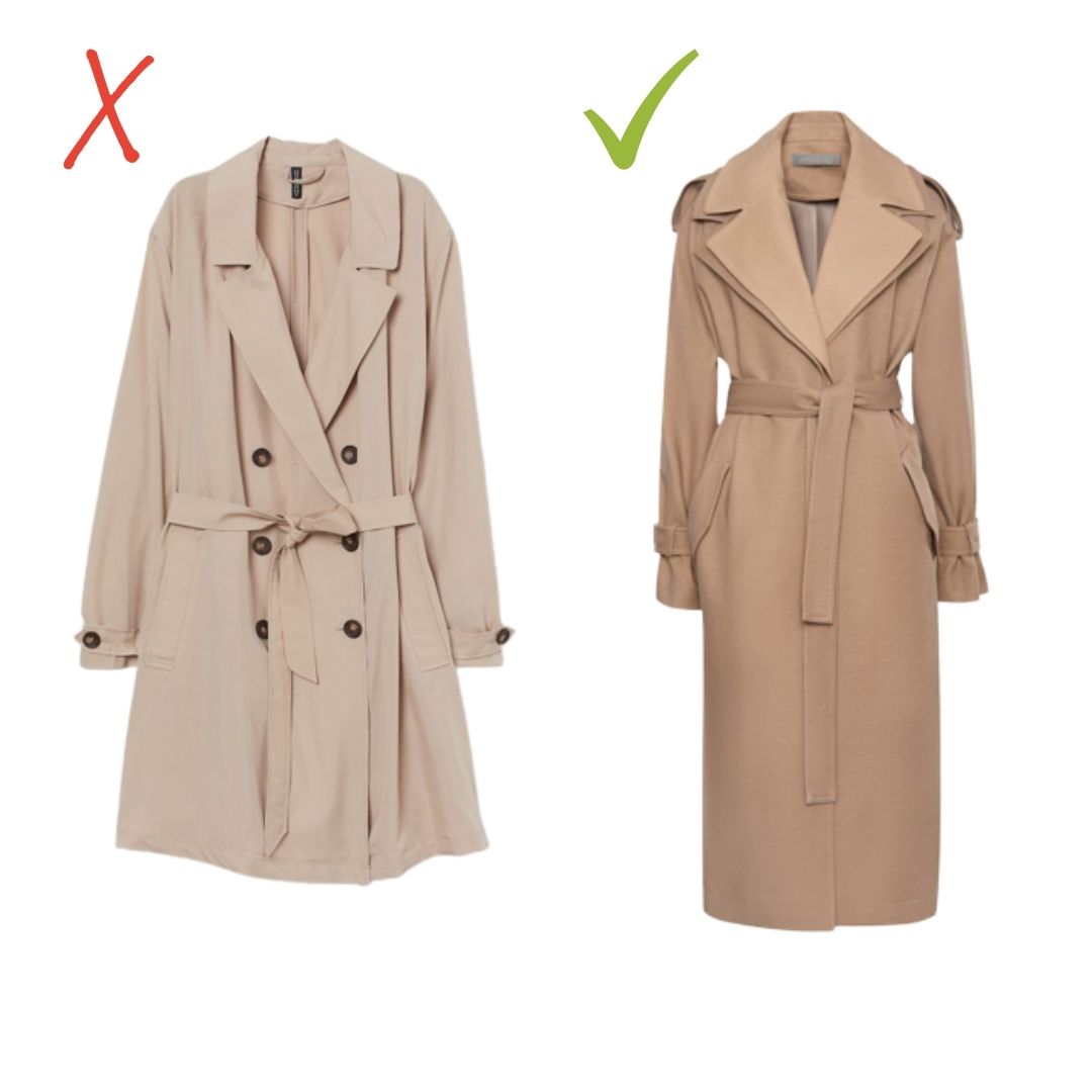 Trends für Mäntel, Regenmäntel und Trenchcoats gehen zu Schnitten mit Midi und Maxi Länge. Daher solltest du Varianten, die oberhalb des Knies enden, aus deiner Garderobe ausschließen.