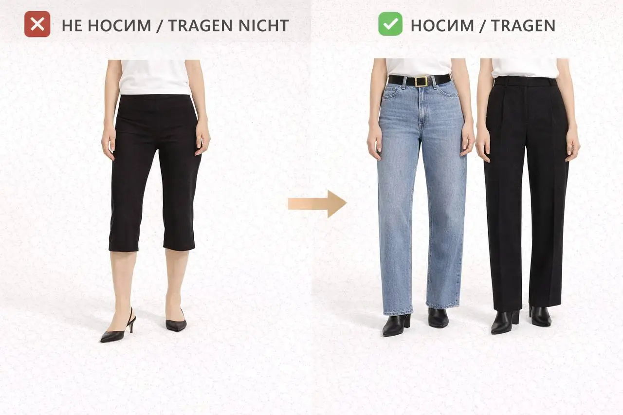 Diese Länge lässt die Beine kürzer erscheinen, unabhängig vom Material.