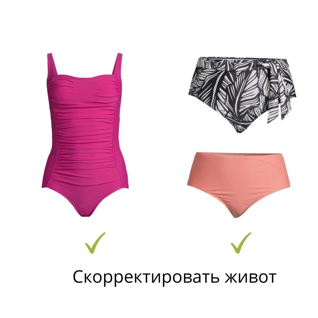 Выбирайте горизонтальные линии, низкую посадку и раздельные купальники.