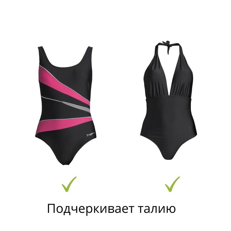 Слитные купальники с драпировкой, высокой посадкой и плотной тканью — всё это работает как «плоский живот за 3 секунды».