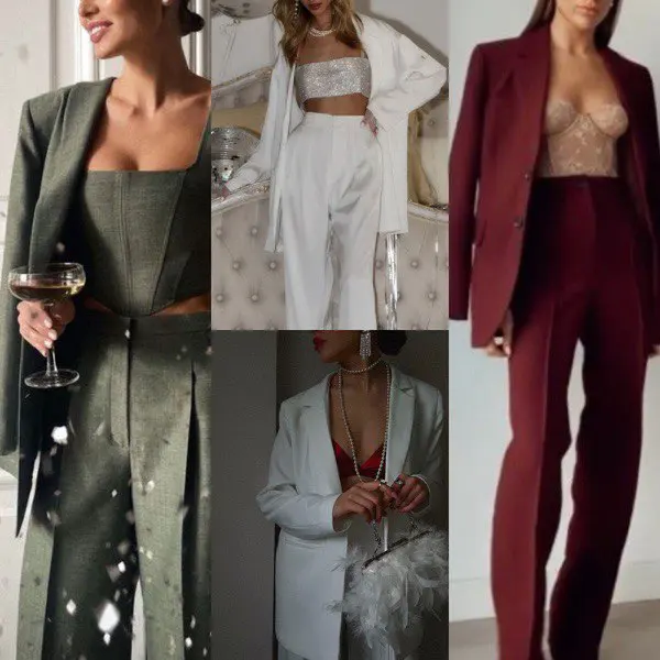 - Брючные костюмы: добавьте роскошный топ из шелка или пайеток – и готово!