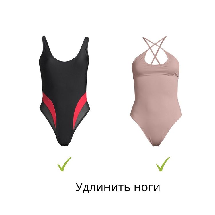 3. Визуально длинные ноги делают фигуру стройнее. Удлинить ноги помогут следующие фасоны: плавки c высокими вырезами или с завышенной талией, слитные купальники с глубоким декольте. Также девушкам небольшого роста я не советую носить трусики-шортики.