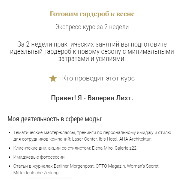 Здесь важно, чтобы клиентка по моей системе разобрала свой гардероб, составила список недостающих вещей и шопинг-лист. Подробно об этом я рассказываю в своем курсе «Готовим гардероб к весне«.