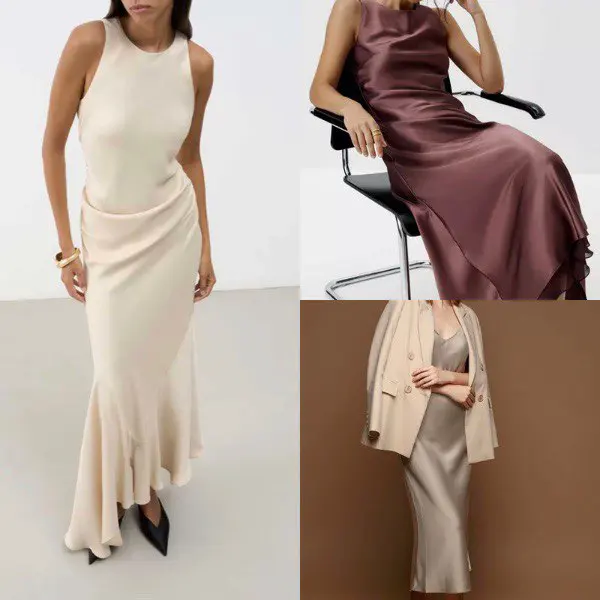 Актуальная альтернатива — платья-комбинации из шелка или сатина. Эти материалы придают образу легкость и женственность, идеально вписываясь в современные тренды.