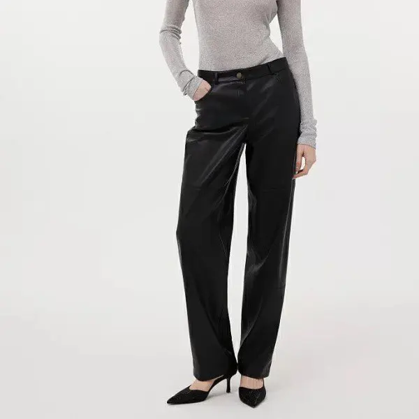- Кожа — строгая и уверенная, идеально подходит для акцентов: кожаная юбка, брюки или жакет.