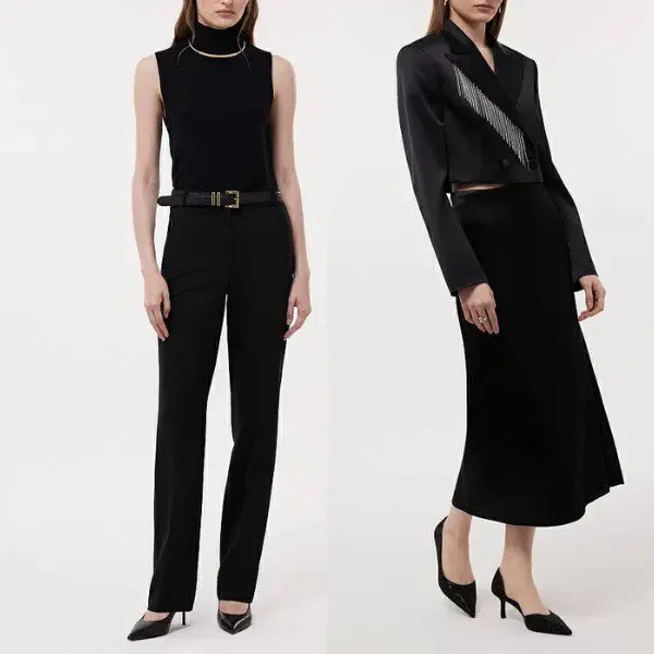 Если вы хотите добавить немного динамики, допустимо сочетание максимум двух оттенков черного. Например, брючный костюм может быть из более матовой ткани, а топ — слегка блестящим или полупрозрачным, но главное — чтобы разница была тактичной и незаметной на первый взгляд.
